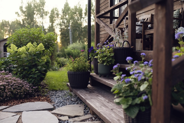 Площадку у бани нужно красиво оформить. Очень хорошо подходят к стилистике этой зоны хвойники — можно окружить банный уголок сосенками, елями или туями. На самой площадке хорошо будет смотреться множество контейнеров с цветами и не только. Здесь лучше поместить крупные горшки и ящики с пряностями, лекарственными и ароматными растениями. Кстати, их же можно использовать для заваривания чая после парилки, для приготовления лечебных отваров. Кое-какие душистые травы могут расти прямо посреди мощения, если вы при его устройстве оставите для них «окна».