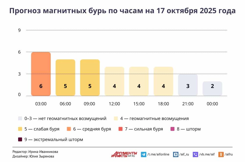 Прогноз магнитных бурь по часам на 17 октября 2025 года. Инфографика