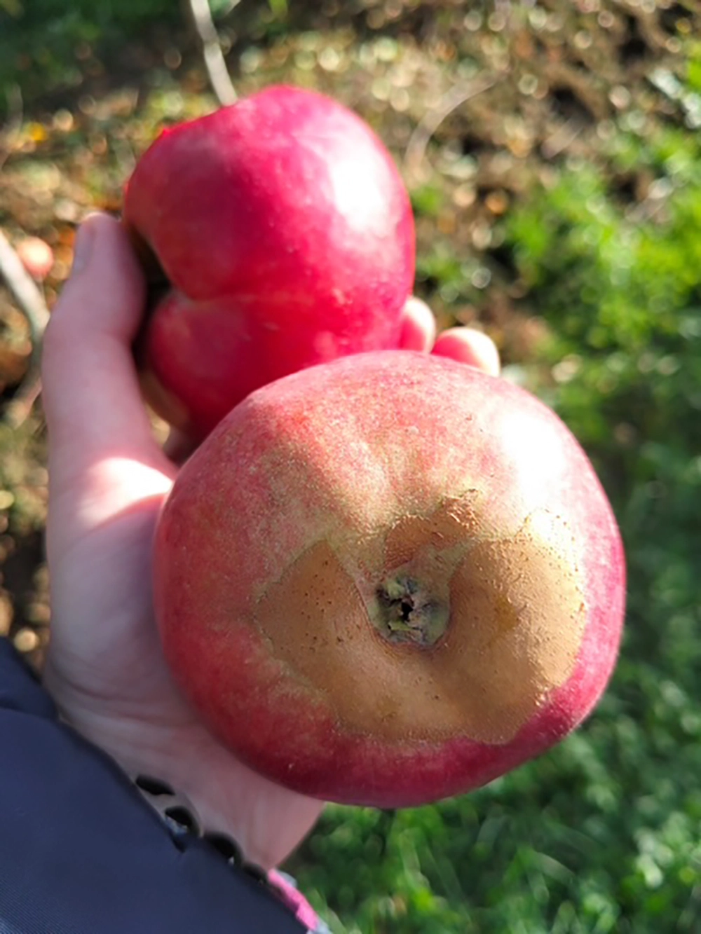 Темные пятна. Это, по словам эксперта, признаки парши. «„Симптомы“ этого заболевания сначала видны на листьях, а затем уже и на плодах, — говорит Олег Кобец. — Лечить заболевшую яблоню можно, но лучше предотвратить паршу. Сделать это можно сейчас, осенью». По словам эксперта, деревья обрабатывают карбамидом плюс сульфатом меди трёхосновным, либо добавляют железосодержащие препараты. Простым способом лечения парши является и побелка. Но, конечно, предварительно надо счистить с яблони грибок. И рядом с ней убрать опавшие листья и мусор. Есть яблоки с признаками парши, или пускать их в переработку, в принципе можно, это не опасно, надо только счистить испорченную часть.