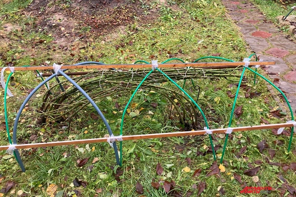 Обязательно используем шпильки. Самое простое — это ивовый прут, достаточно толстенький, который будет хорошо гнуться. Им пришпиливаем побеги к почве. Дальше ставим дуги и укрываем нетканым материалом.
